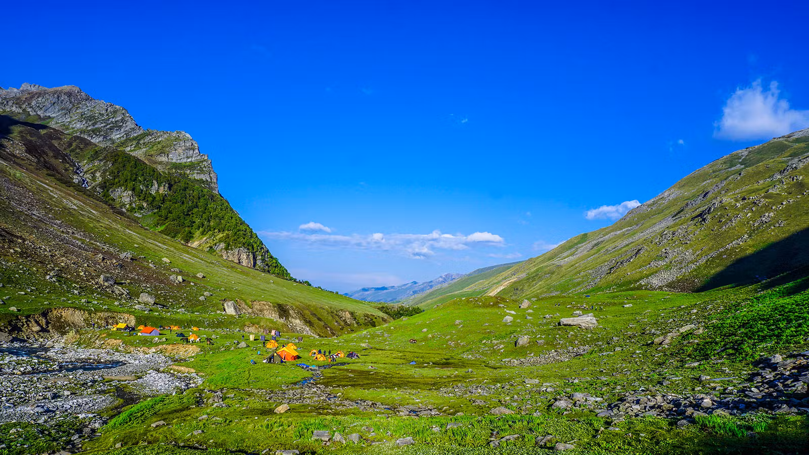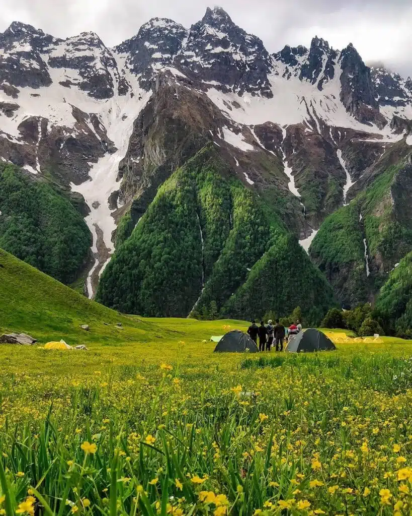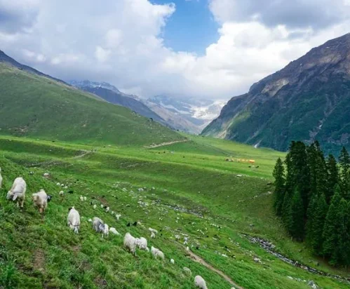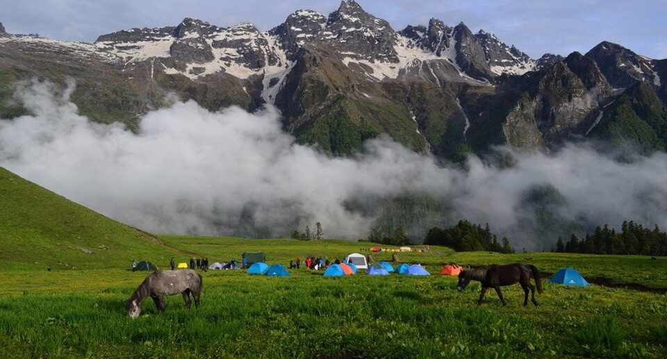 Begin trekking from Janglik through dense forests and meadows to reach the stunning Dayara Thatch campsite.